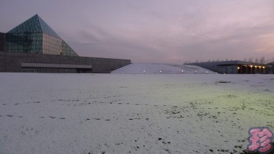 敷地内を歩いていると、ガラスのピラミッドが現れる。無機質な三角形の塊が、白銀の大地に突き刺さるように建っているその姿は、どこか異様で、まるでUFOの着陸跡のようでもある。